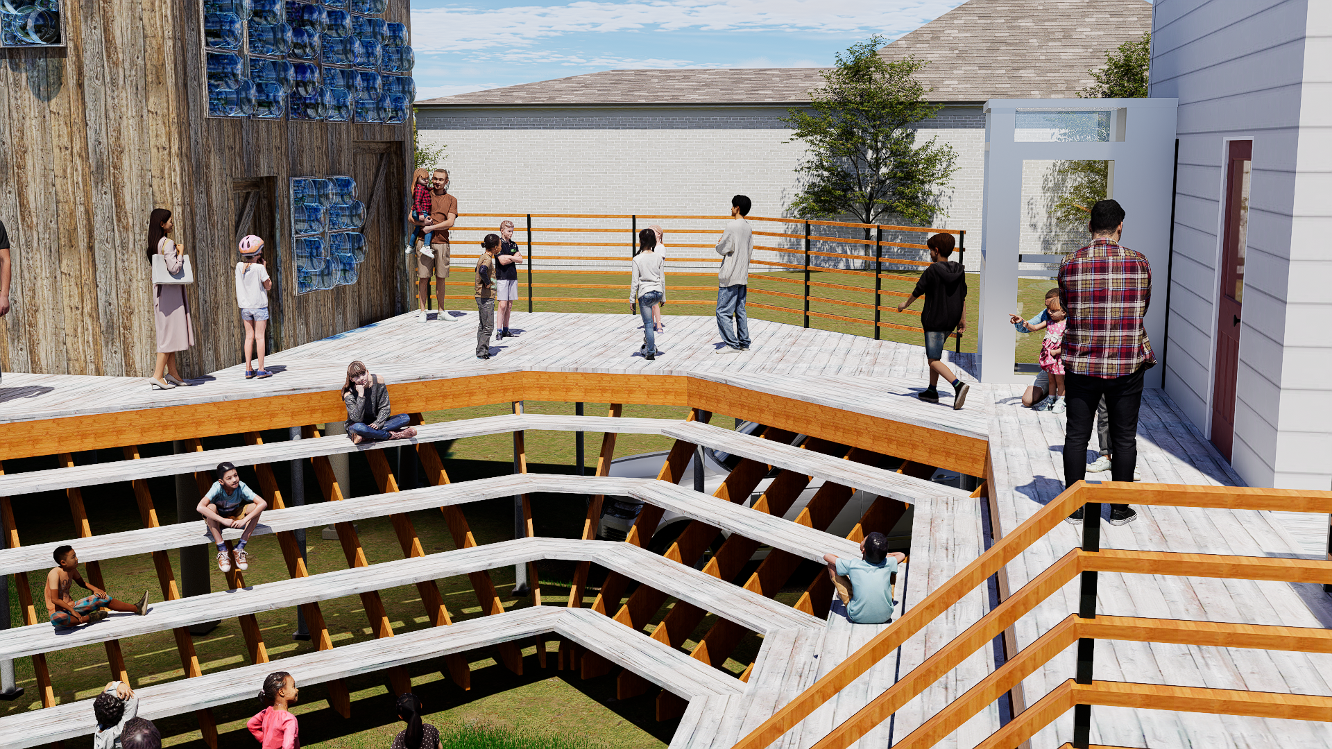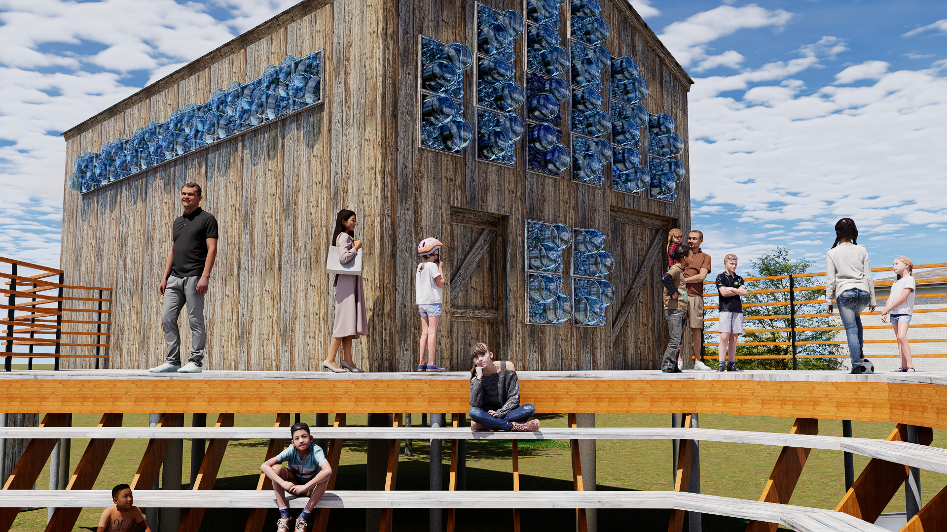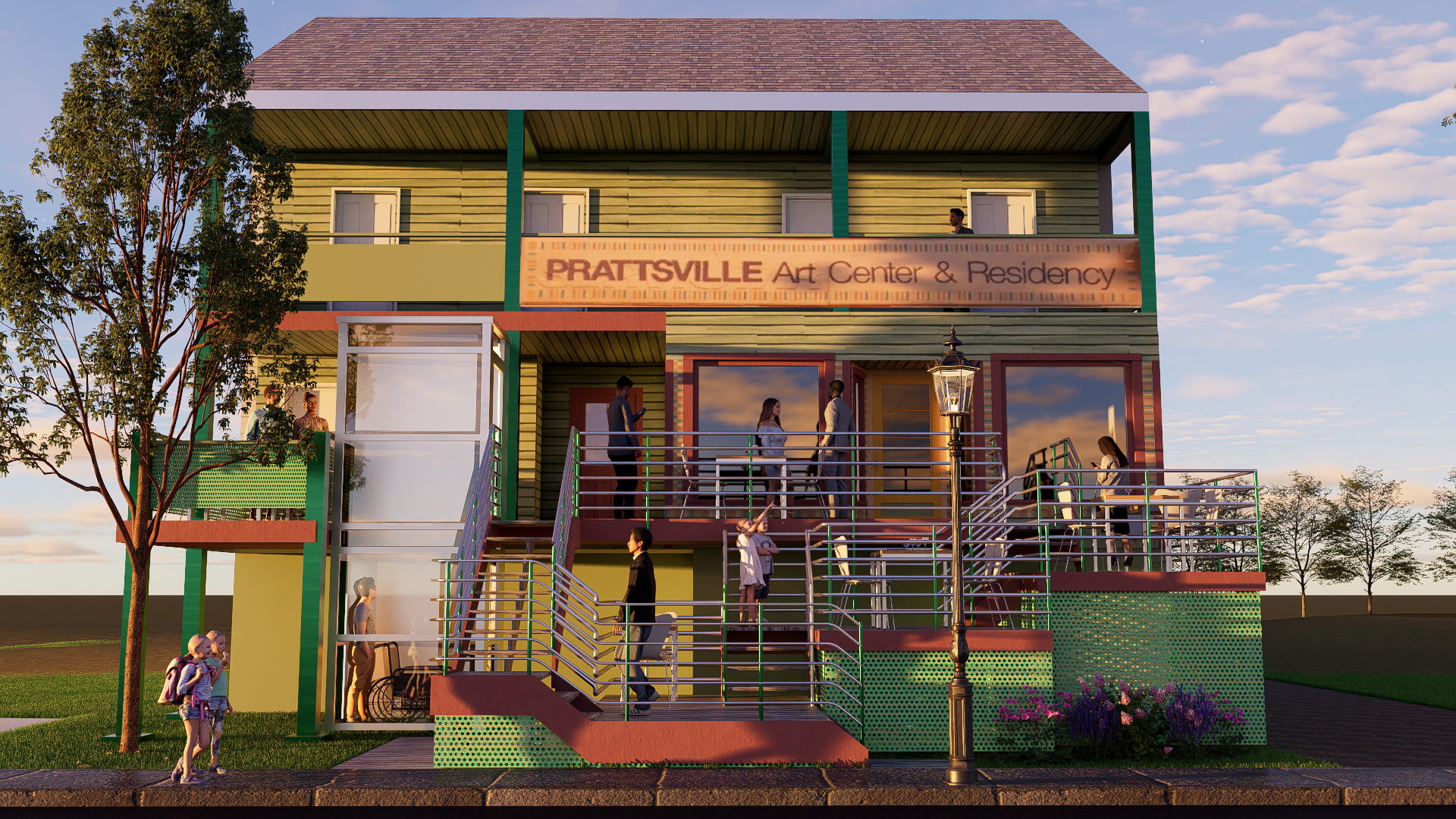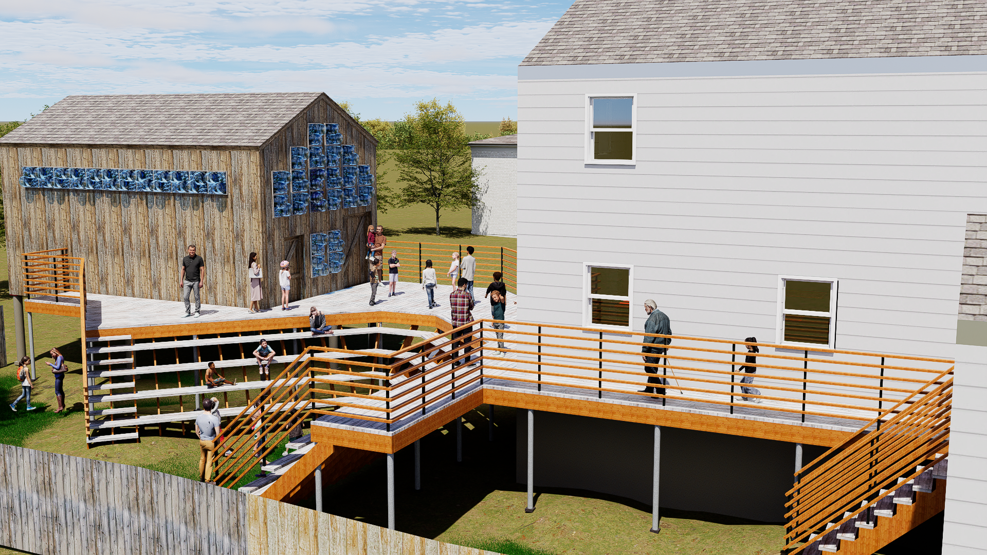 In response to Hurricane Irene and the floods that devastated the town, the project requirement was to raise the existing art center and barn above the floodplain. In addition to raising the buildings, these propositions include a front deck, wheelchair accessibility, and outdoor bleachers in the rear for lectures.